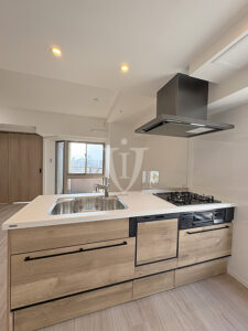 天然木調パネルが温かみのある高級感を演出するシステムキッチンです。