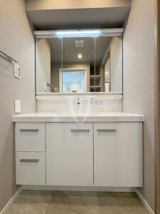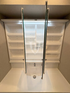 三面鏡タイプの鏡の裏側は収納になっています。