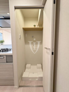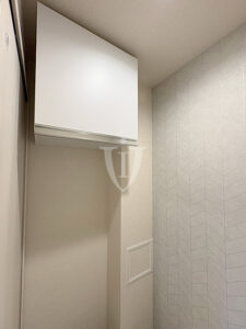 クローゼットタイプのランドリースペース、上部には収納棚が付いています。