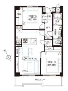 リビングとバルコニーに接する約5.9帖の洋室1です。