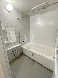 ライトグレーの石調パネルがくつろぎの空間を演出する、ゆったりサイズのバスルームです。