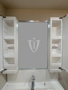 一列トールタイプの扉には大きな一枚鏡が貼り込んであり、毎日の身だしなみチェックに活躍してくれそうです。