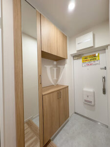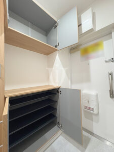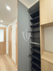 玄関収納は二列カウンタータイプと一列トールタイプを組み合わせた複合ユニットを採用。