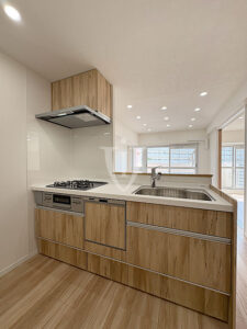 ウッド調パネルで高級感のあるシステムキッチンです。