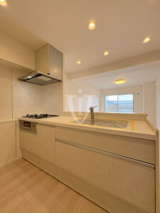 ライトベージュパネルで清潔感のあるシステムキッチンです。