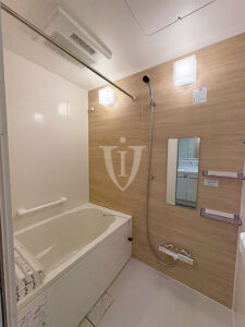 ウッド調パネルが癒しの空間を演出する、ゆったりサイズのバスルームです。