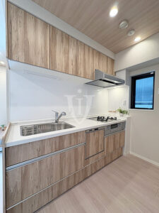 ウッド調パネルで高級感が演出されたシステムキッチンです。