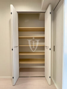 こちらのリビングは扉付きの可動棚収納が付いています。