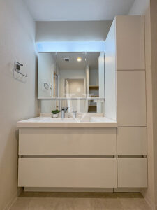 ハンドシャワー水栓を採用したワイドサイズミラーのドレッサー、サイドキャビネット付きで収納力も充実。