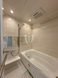 ベージュのグラデーションパネルが優しいくつろぎの空間を演出する、ゆったりサイズのバスルームです。