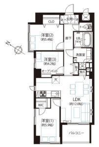 9階南西角住戸で陽当たり眺望良好、収納充実の3LDKタイプです。