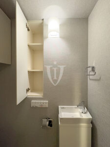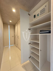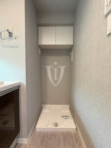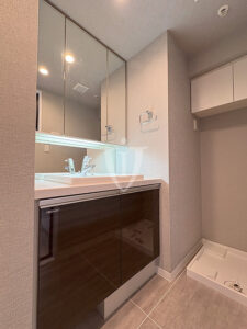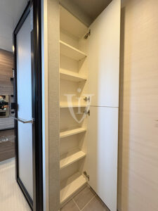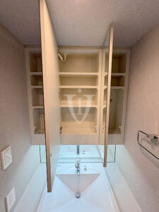 バスルーム横には扉付きの可動棚収納が付いています。