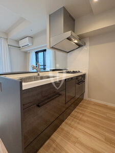 ダークブラウンパネルで高級感のあるシステムキッチンです。