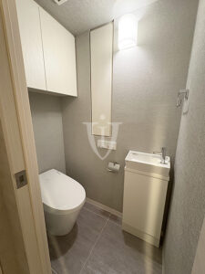 横にも扉付きの収納が設けられ、もちろん独立手洗い器も付いています。