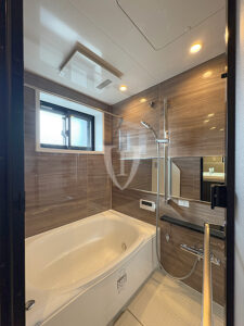 マホガニー調グロスパネルがゴージャスな空間を演出する、ゆったりサイズのバスルームです。