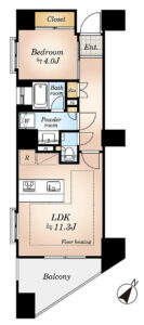 11階南東・南西の角住戸で1LDKタイプです。