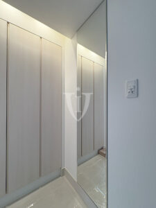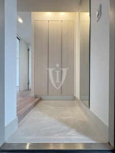 玄関収納の横壁面には一枚鏡が貼り込んであり、毎日の身だしなみチェックに活躍してくれそうです。