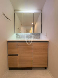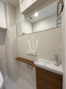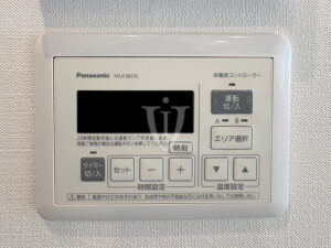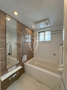 マホガニー調グロスパネルがゴージャスな、ゆったりサイズのバスルームです。