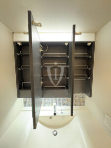 三面鏡の裏側は収納になっています。