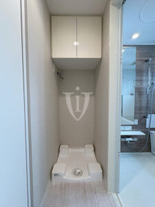 排水管の清掃がしやすい高下駄式の防水パンを採用したランドリースペースです。