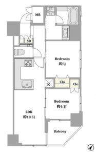 5階南東・北東の角住戸で陽当たり良好な2LDKタイプです。