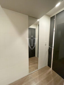 廊下壁面には大きな一枚鏡が貼り込んであり、毎日の身だしなみチェックに活躍してくれそうです。
