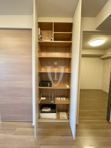 こちらのお部屋にはさらにコの字型ユニット収納が付いています。