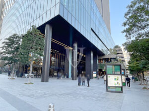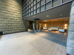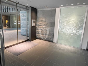 重厚な石積の壁面に水面の揺らぎを感じさせるガラスウォールが印象的なエントランスです。