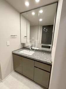 三面鏡タイプの鏡の裏側は収納になっています。