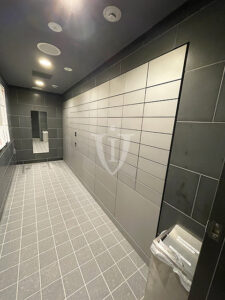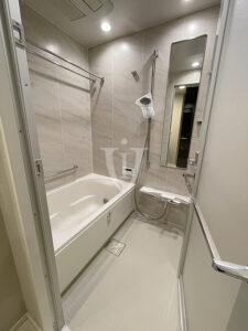 天然石調パネルが素敵なくつろぎの空間を演出する、ゆったりサイズのバスルームです。