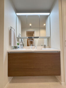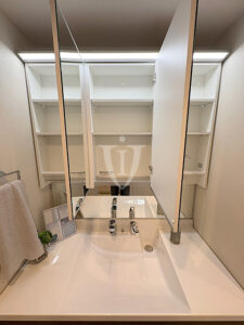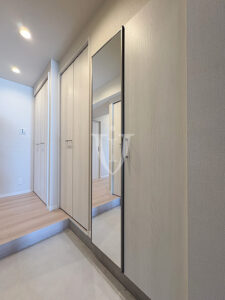 扉の片側には大きな一枚鏡が貼り込んであり、毎日の身だしなみチェックに活躍してくれそうです。