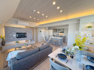 二面採光で明るく間接照明で演出された折り上げ天井が素敵な約17.7帖の広々リビングです。
