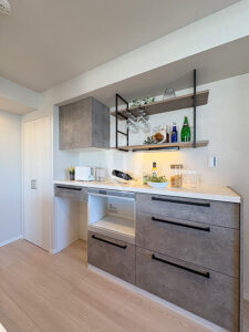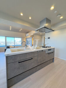 グレーのむら染め調パネルで高級感が演出されたアイランドキッチンです。