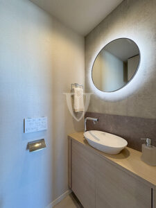 間接照明に浮かび上がるサークルミラーの演出も素敵な独立手洗い器が付いています。