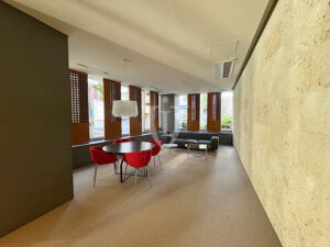 デザイナーズポップなソファーにセンスが光る、柔らかに外光を取り込むエントランスロビーです。