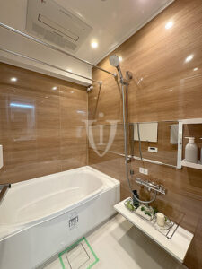マホガニー調グロスパネルがゴージャスな、ゆったり1317サイズのバスルームです。