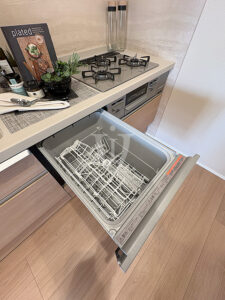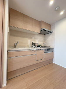 ナチュラルウッド調パネルが柔らかな温かみを感じさせるシステムキッチンです。