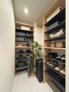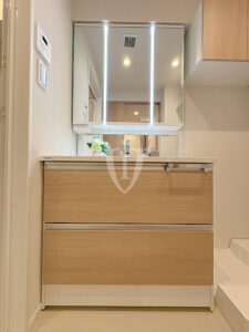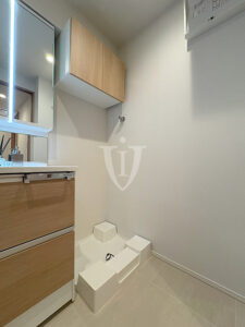 排水管の清掃がしやすい高下駄式の防水パンを採用したランドリースペースです。