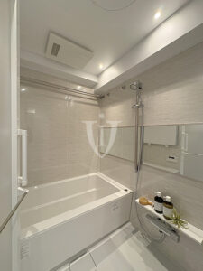 ベージュサンドストーン調グロスパネルが素敵なくつろぎの空間を演出する、ゆったりサイズのバスルームです。
