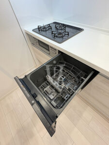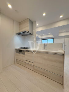ウッド調パネルが柔らかな温かみを感じさせるシステムキッチンです。