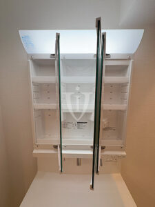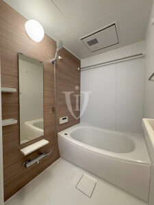 マホガニー調グロスパネルがゴージャスな、ゆったりサイズのバスルームです。