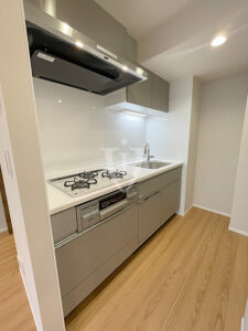 マットグレーのパネルがシックな高級感を演出するシステムキッチンです。