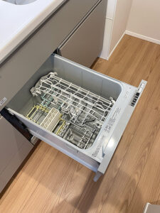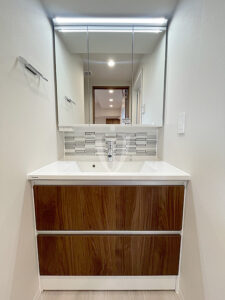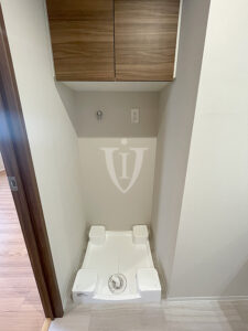 排水管の清掃がしやすい高下駄式の防水パンを採用したランドリースペースです。