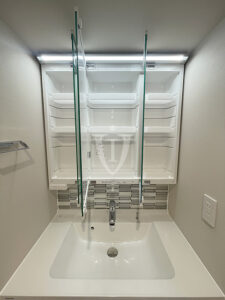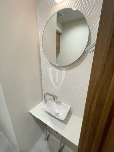 アクセントクロスにサークルミラーがおしゃれな独立手洗い器が付いています。