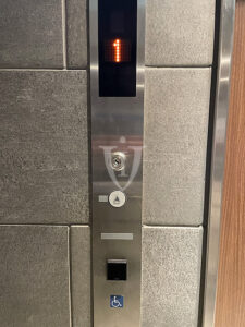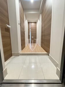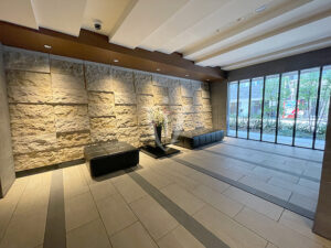 存在感のある石貼りの壁面をダウンライトで演出した、ハイ&ワイドガラスエリアから柔らかに外光を取り込む広々エントランスホールです。