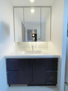 三面鏡タイプの大型鏡は裏側も収納になっていて収納力たっぷり。