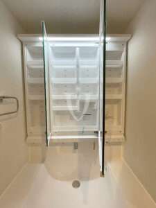 三面鏡タイプの鏡の裏側は収納になっています。