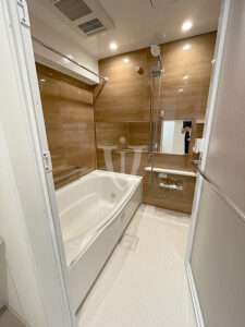 マホガニー調グロスパネルがゴージャスな、ゆったりサイズのバスルームです。
