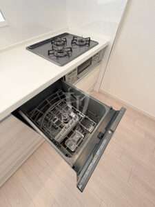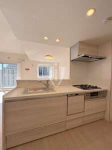ホワイトウッド調パネルで清潔感のあるシステムキッチンです。