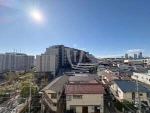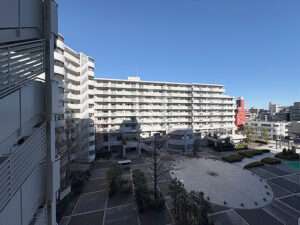北向きバルコニーからの眺望、前面は同マンションの別棟ですが、しっかり間隔が空いているため圧迫感はありません。
